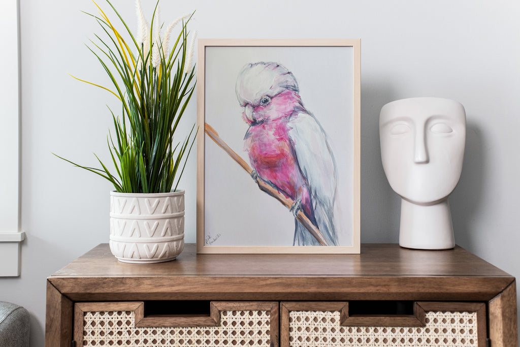 Modern original Australian pink Galah painting created in acyclic and graphite. Surprisingly colourful and vibrant, this expressive native bird artwork would make a wonderfully unique gift or elegant addition to your modern or Country style decor.